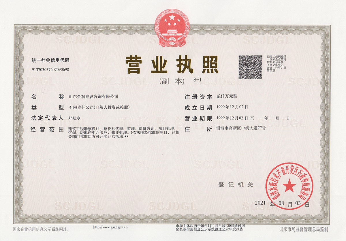 • 2002年12月,公司名称由“淄博东华审计咨询有限公司”更名为“山东金润建设咨询有限公司”,注册资本增加到200万,公司字号“金润”的含义是“视诺如金,以德润物”。