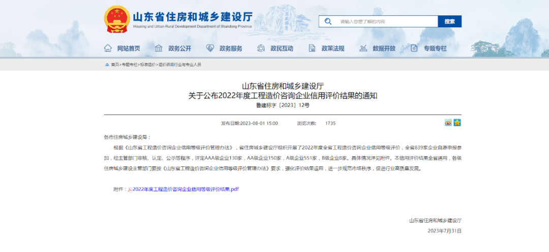 祝贺山东金润建设咨询有限公司获得2023年度山东省工程造价咨询企业AAA级信用等级证书。
